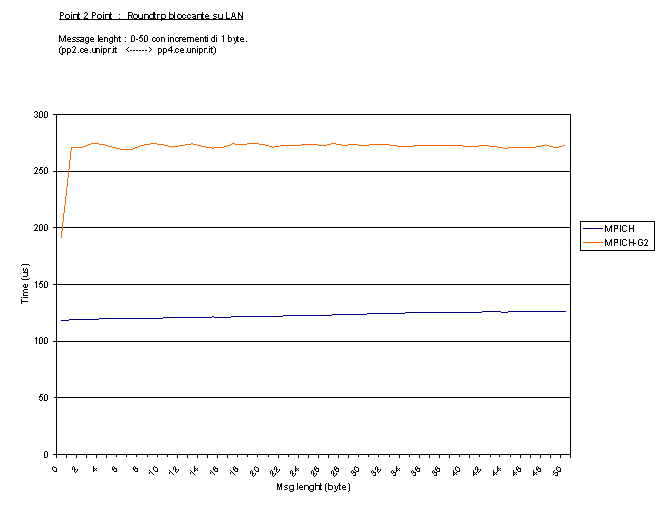 A questi test è necessaria una piccola premessa. Come abbiamo anticipato nella sezione Communication Management, la documentazione ufficiale di MPICH-G2 (MPICH-G2: A Grid-Enabled Implementation of the Message Passing Interface, N. Karonis, B. Toonen, and I. Foster) riporta come attualmente MPICH-G2 non sia stato ancora ottimizzato completamente per il funzionamento TCP/IP. Questo rende un pò difficile capire dove le prestazioni siano peggiori per l'intervento di GlobusToolkit o per la mancanza di ottimizzazioni rispetto a MPICH. Proveremo comunque a trarre alcune conclusioni.