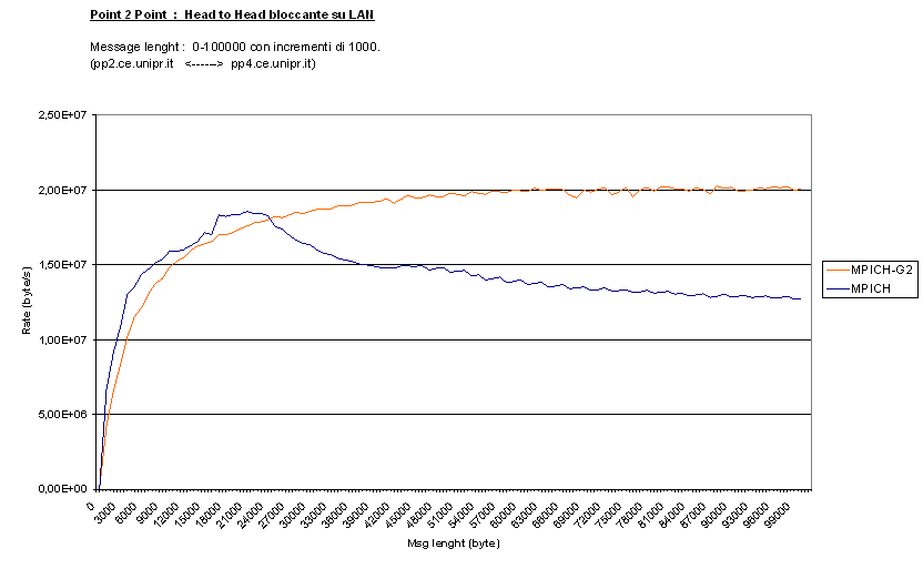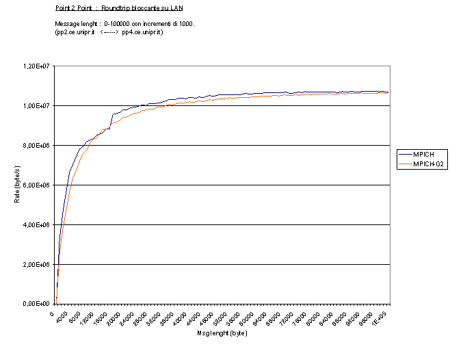è interessante notare come, con messaggi abbastanza grandi, le prestazioni di MPICH ed MPICH-G2 siano praticamente identiche. Entrambi, con un byte rate massimo di circa 86Mbs, si avvicinano molto alla totale occupazione della banda disponibile di 100Mbs. Inoltre, osservando il test block_R16 riportato sotto, è possibile dedurre che questo avvicinamento non è dovuto semplicemente al fatto che l'overhead presente per piccoli messaggi diventi trascurabile con quelli grandi, ma il divario diminuisce chiaramente al crescere della dimensione dei messaggi. Questo potrebbe essere dovuto alla diversa implementazione di MPICH-G2 delle primitive di spedizione MPI_xsend. Come già anticipato (Communication Management) MPICH-G2 utilizza direttamente il buffer utente per eseguire una spedizione, senza crearne uno appositamente per la funzione send. Questo per messaggi grandi avvantaggia MPICH-G2, che recupera il divario iniziale creato dalla gestione separata di dati e header e dalle operazioni di GlobusToolkit.