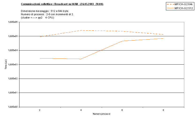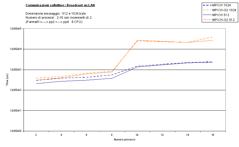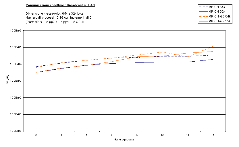 ora le differenze sono molto minori, sia per messaggi grandi che piccoli. Probabilmente ciò è dovuto al diverso algoritmo utilizzato da questo test, che riesce ad evitare che più di una MPI_Broadcast venga eseguita contemporaneamente, diminuendo il carico di lavoro per ogni CPU. Quindi in questo caso MPICH-G2 sente di meno la presenza di più processi su una singola CPU. Inoltre questo test ci permette di concludere che l'implementazione della MPI_Broadcast su LAN è la stessa sia per MPICH che per MPICH-G2, potendo quindi imputare, con maggiore sicurezza, la differenza di prestazioni nel test precedente alle diverse occupazioni di CPU.
