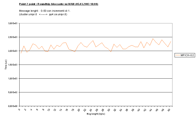 | MPICH-G2 | 270,5 us(*) 191,14 us(**) | 10,6 Mbyte/s | 2*10e3 us circa | 800Kbyte/s circa |