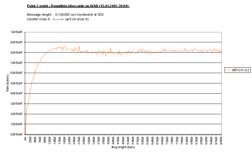 qui non si riesce ad occupare più di 6.4Mbs dei 10Mbs disponibili, percentuale comunque piuttosto alta, tenuto conto che la rete utilizzate che collega al Centro di Calcolo al cluster Parma2 è utilizzata da molti utenti a tutte le ore del giorno e della notte. Notare come la banda viene saturata molto presto, già con messaggi di 10000 byte (per Roundtrip) si è raggiunto il massimo, e che la limitata banda appiattisca le differenze tra Roundtrip e Head to Head