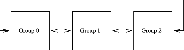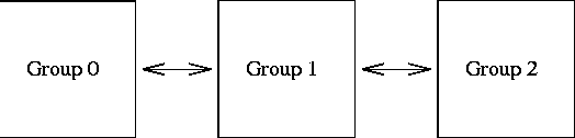 Groups 0 and 1 communicate. Groups 1 and 2 communicate. Therefore, group 0 requires one inter-communicator, group 1 requires two inter-communicators, and group 2 requires 1 inter-communicator.