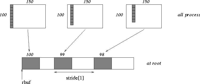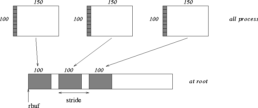 Same as Example Examples using MPI_GATHER, MPI_GATHERV on the receiving side, but send the 100 ints from the 0th column of a 100×150 int array, in C. See figure 5 .