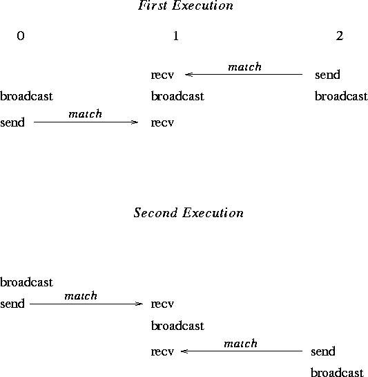 Two possible executions of this program, with different matchings of sends and receives, are illustrated in figure 11 . Note that the second execution has the peculiar effect that a send executed after the broadcast is received at another node before the broadcast. This example illustrates the fact that one should not rely on collective communication functions to have particular synchronization effects. A program that works correctly only when the first execution occurs (only when broadcast is synchronizing) is erroneous.
