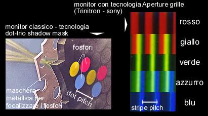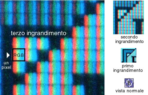 I monitor creano le immagini accendendo i fosfori colorati presenti sullo schermo. Gli elettroni, irradiati dal cannone del monitor, colpiscono i fosfori che a loro volta emettono luce. Ogni punto (pixel) sullo schermo e' definito da questi tre fosfori (vedi immagine alla voce Risoluzione). Vediamo come si ottengono i colori nei monitor e similmente nei display LCD: