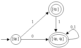 A questo punto risulta piu' semplice capire il inguaggio accettato. q0 rimane sempre il nostro stato iniziale. Se scelgo di andare in [q1] riconosco 1 e posso fermarmi oppure posso proseguire per [q0q1] (e quindi ho riconosciuto 11). Arrivato in [q0q1] posso fermarmi o riconoscere qualsiasi tipo di stringa di 0 e 1, (0+1)*.